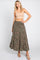 Details A leaf printed midi skirt featuring a smocked waistband, a tiered skirt and a side slit. Content + Care