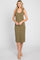 A fitted ribbed midi dress featuring a rounded neckline and a button front.