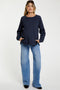 A ribbed knit maternity top featuring a rounded neckline, long sleeves and a round hem with button trim.