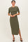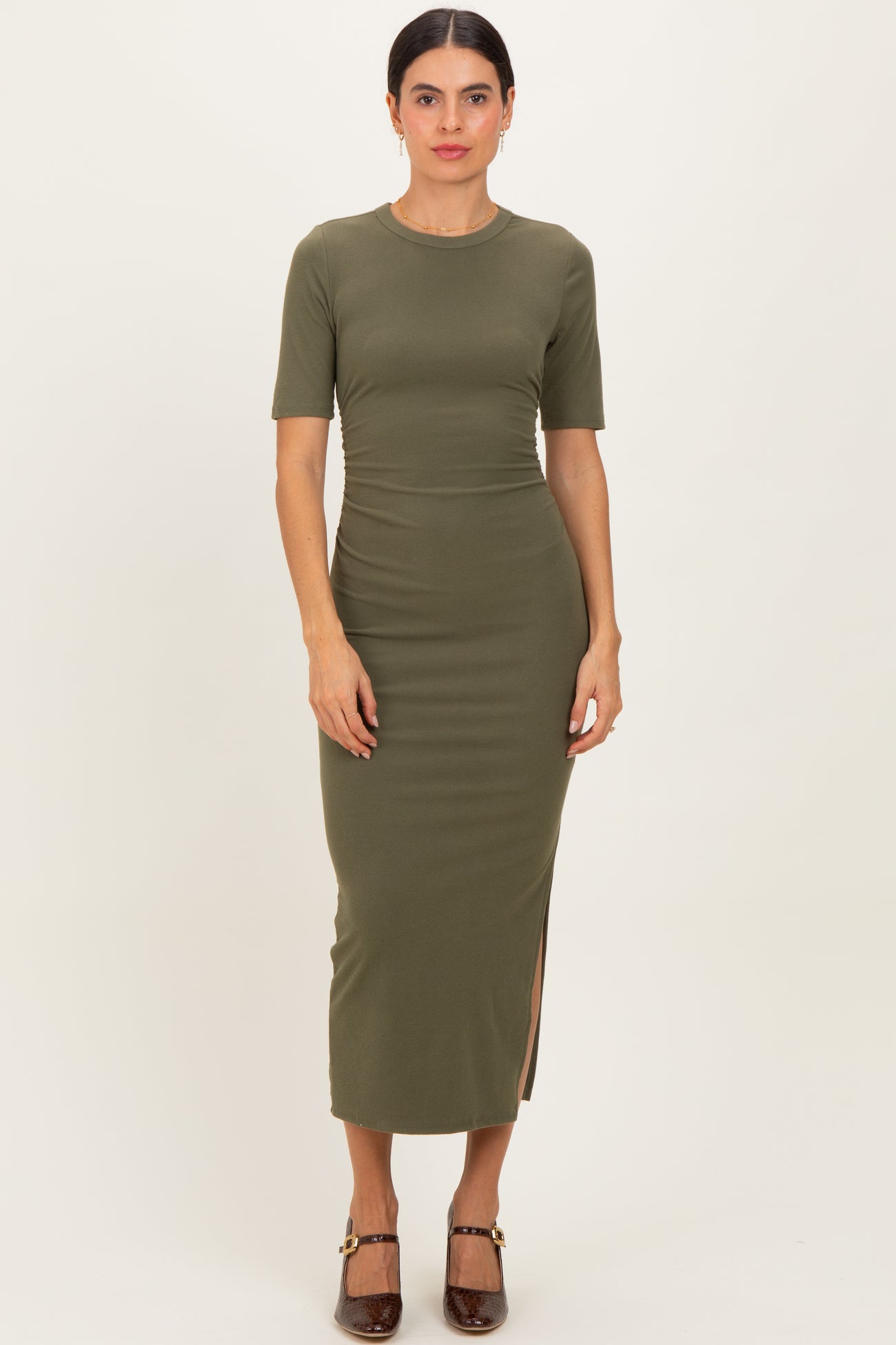 Olive Ruched Side Slit Midi Dress