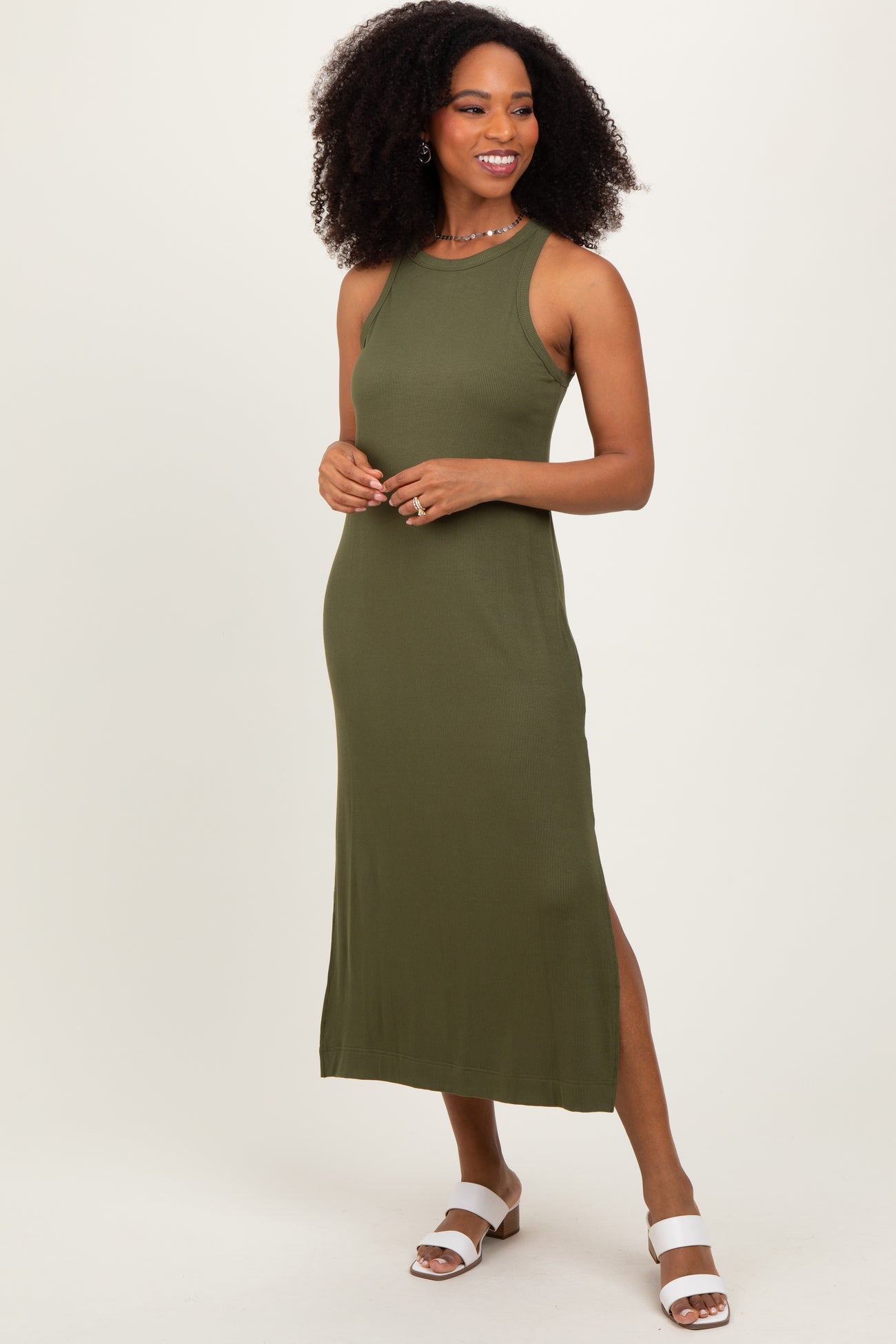 Olive Sleeveless Side Slit Maternity Midi Dress