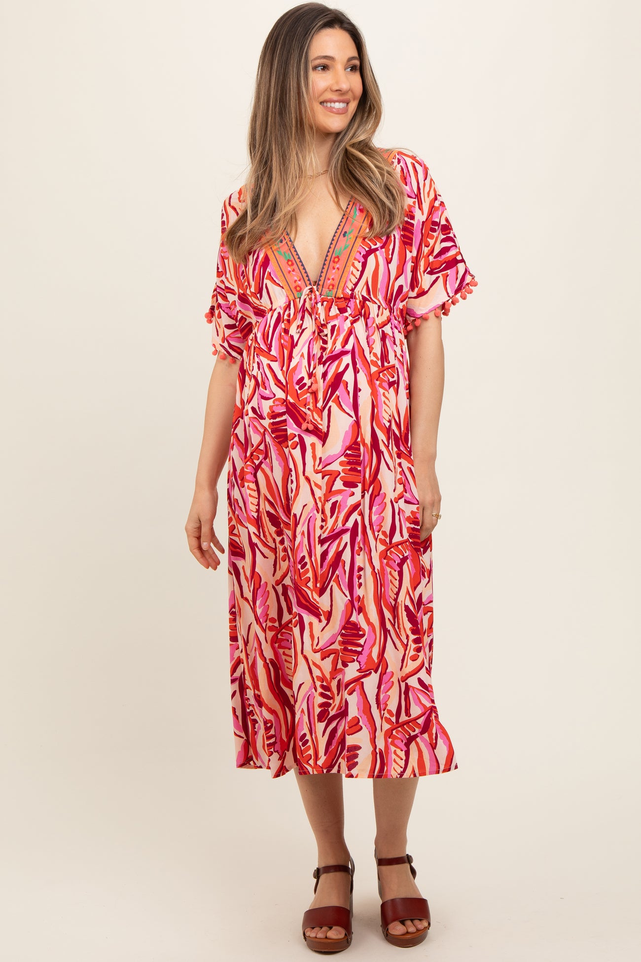 Orange Embroidered V-Neck Short Pom Sleeve Maternity Midi Dress