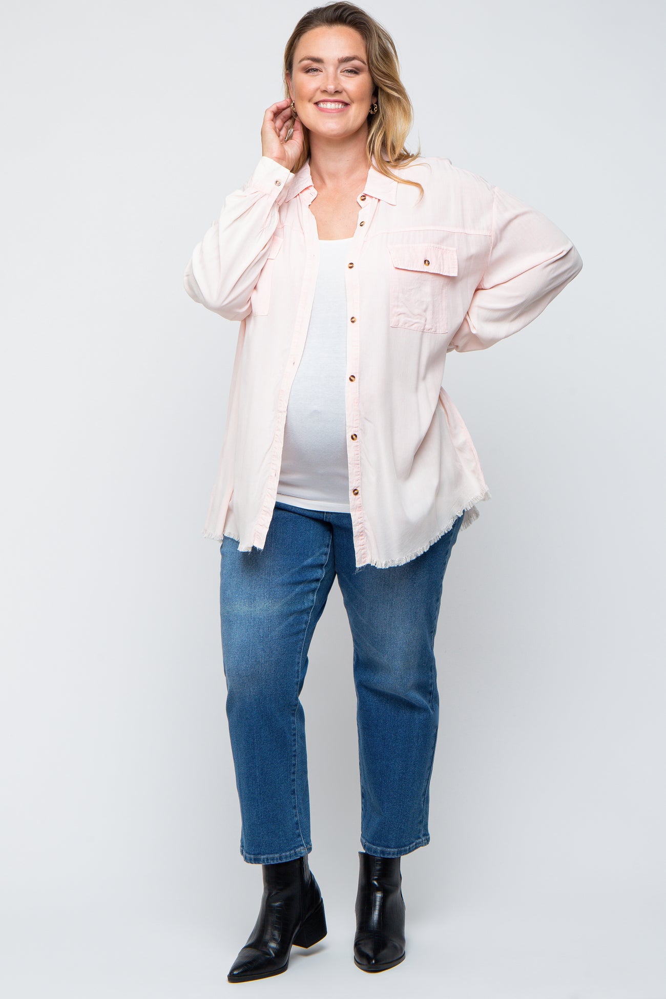 Details A maternity plus size top featuring a collared neckline, a button up front, long sleeves and a rounded hem with fringe trim. Content + Care