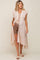A floral, crochet accent maternity cover up. Features a drawstring front tie, cap ruffle sleeves, and a hi-lo hem.