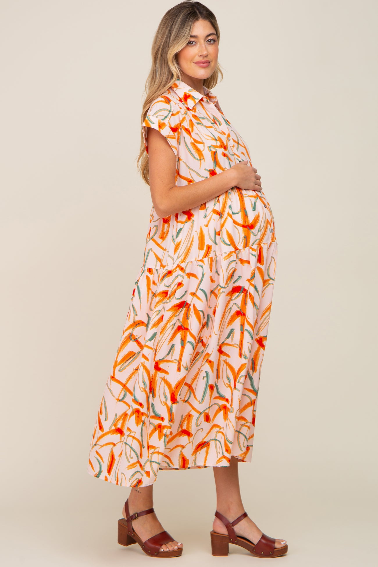 Peach Printed Button Down Collared Tiered Maternity Midi Dress