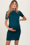 A ribbed knit maternity dress featuring front buttons, short sleeves and a collared neckline.