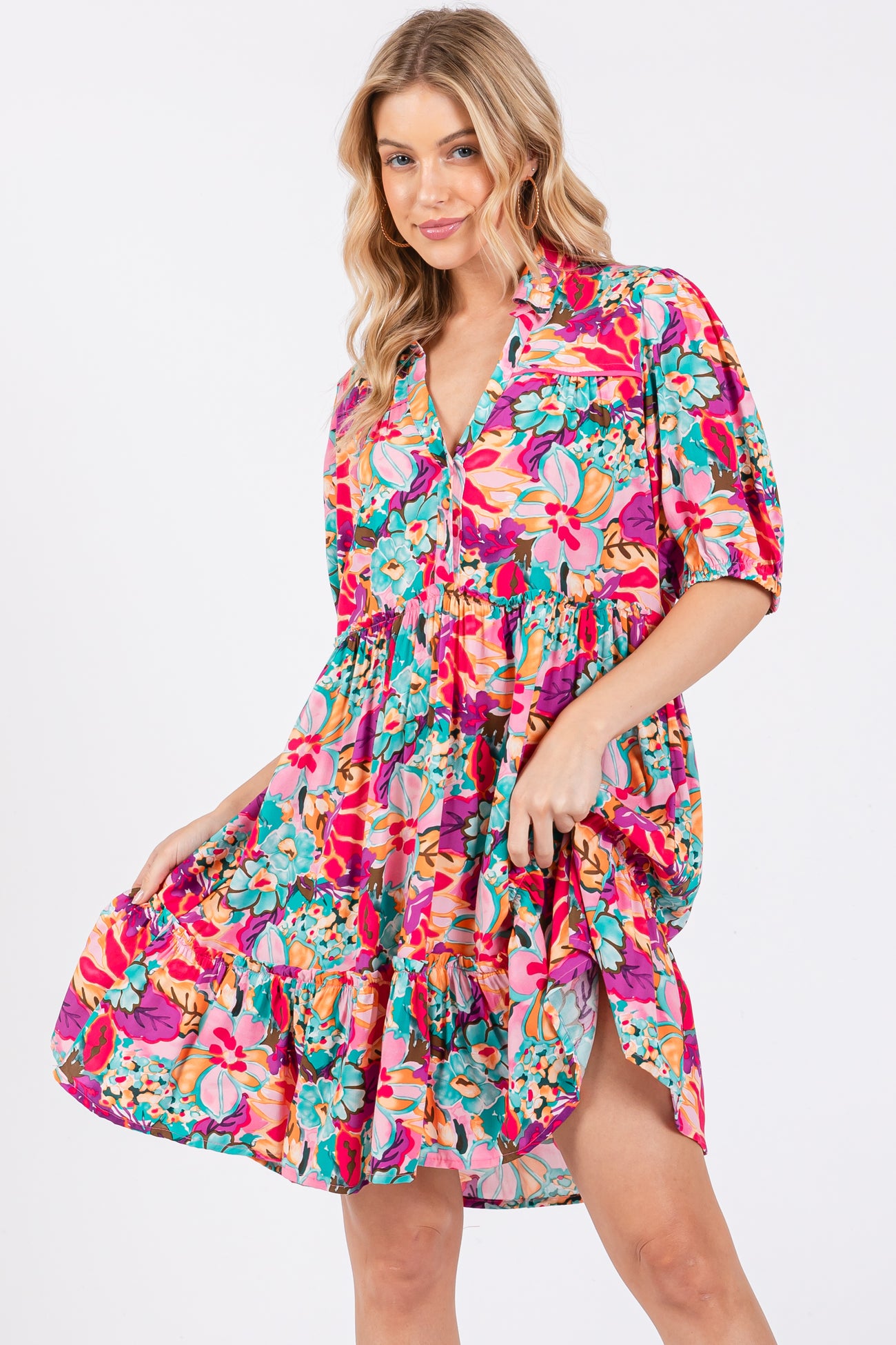 Details Floral short sleeve dress with front buttons, collard v-neckline, and tiered skirt. Content + Care