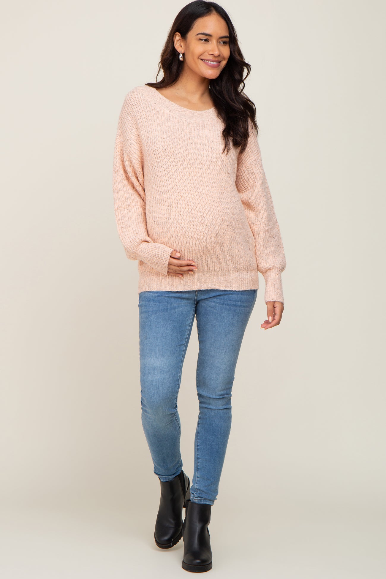 A knit maternity sweater featuring long sleeves, a cutout back, and a rounded neckline.