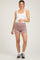 A pair of solid hued maternity lounge shorts featuring an elastic waistband with ruched sides. Material has high stretch.