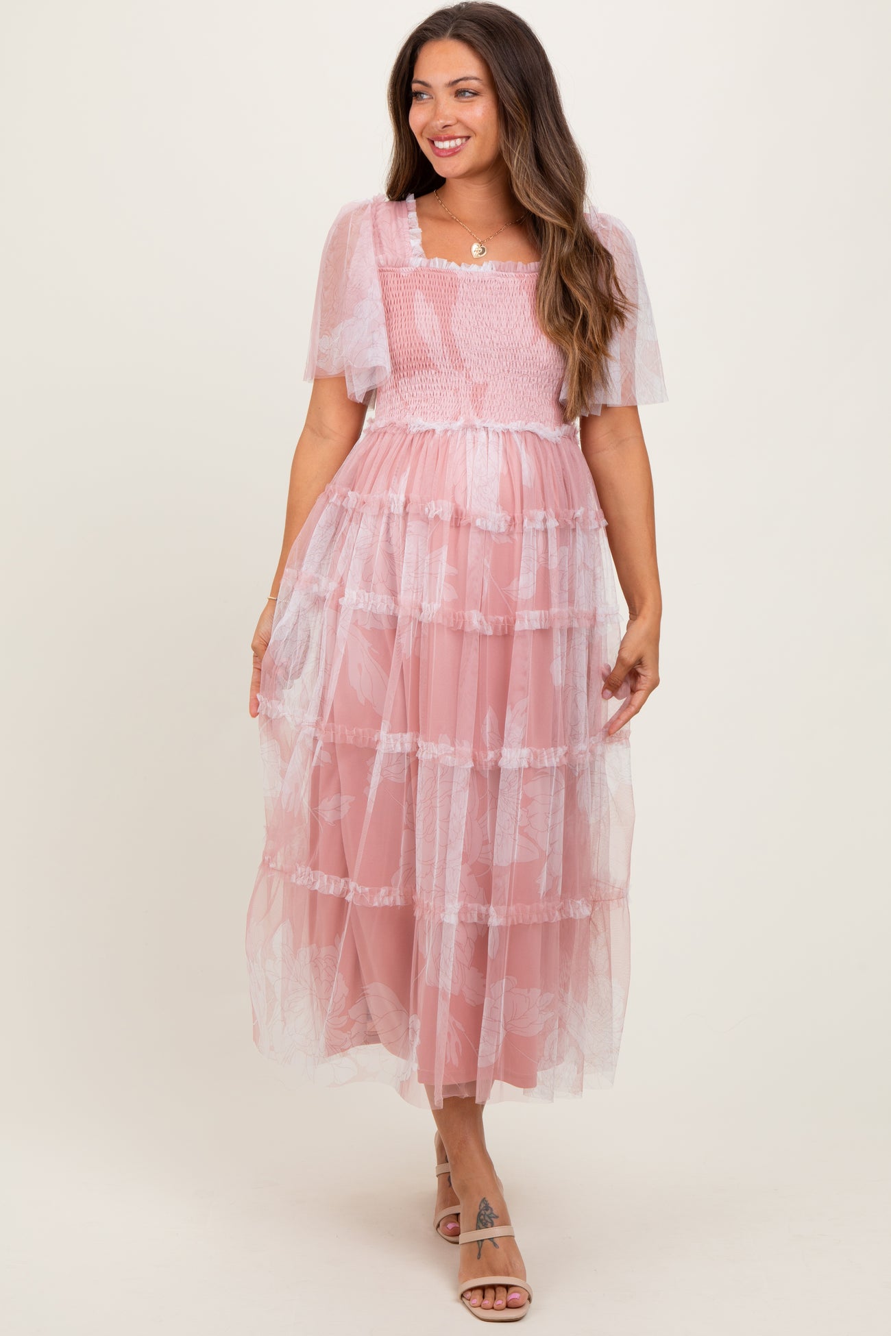 Pink Smocked Top Mesh Ruffled Maternity Midi Dress
