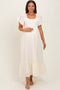 A terry maternity dress featuring short cuff sleeves, side pockets and a collared v-neckline.