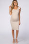A solid hued fitted maternity dress featuring short ruffle sleeves, a ruffle wrap hem, a wrap top and a v-neckline.