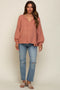 A printed maternity maxi dress with semi sheer long cinched sleeves, a ruffle accent v-neckline, a smocked waist, and a side slit. Dress is lined 1/2 way down.