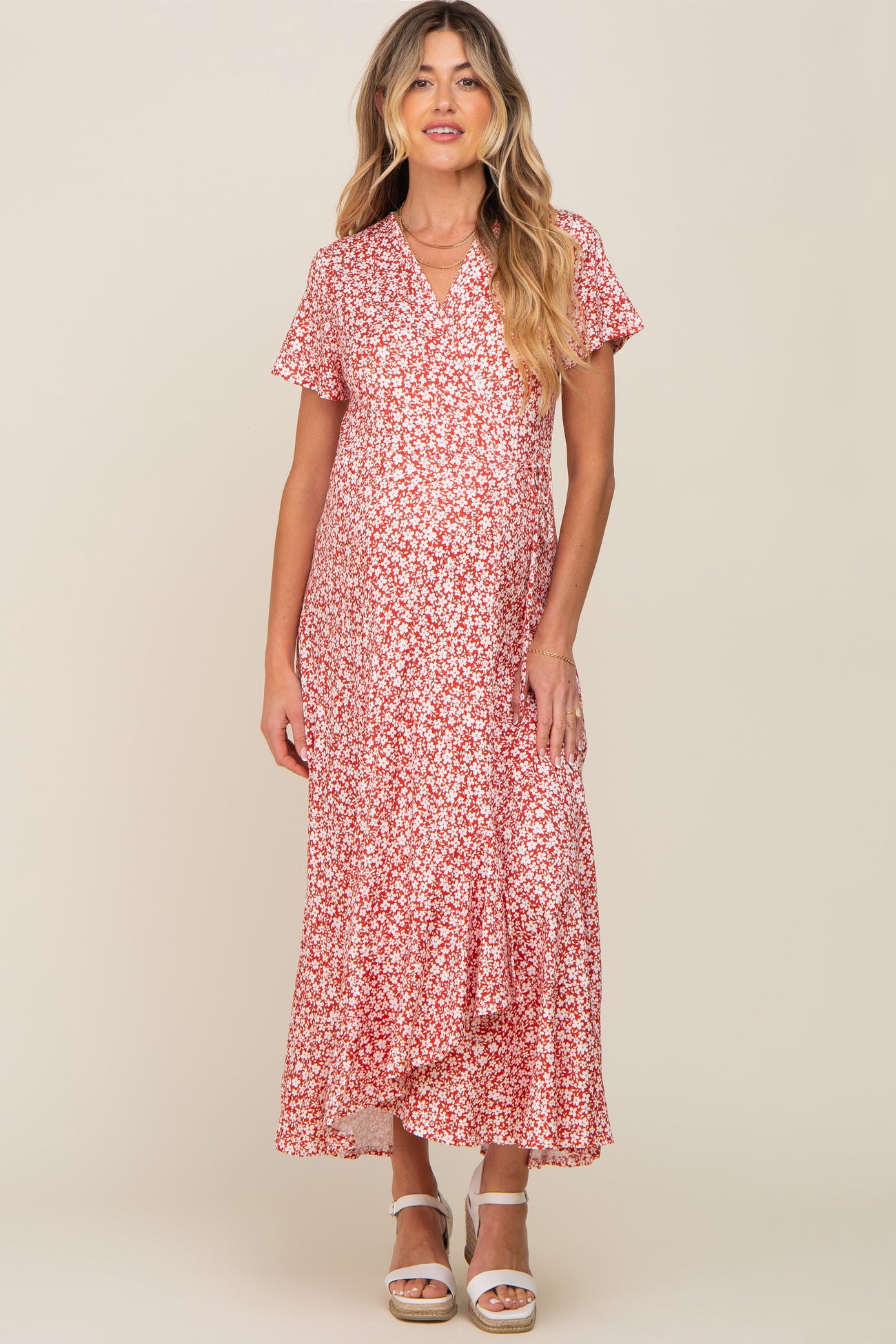 Red Floral Short Sleeve Maternity Wrap Maxi Dress
