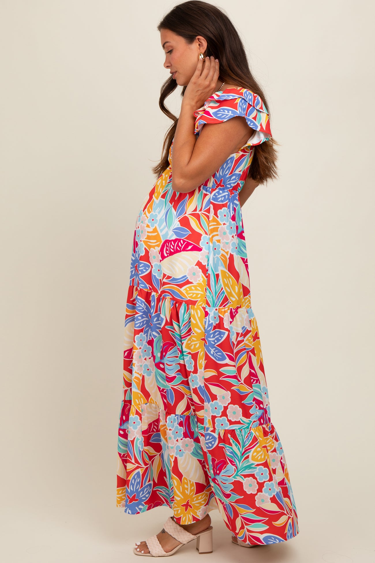 Red Floral V-Neck Layered Flutter Short Sleeve Maternity Midi Dress