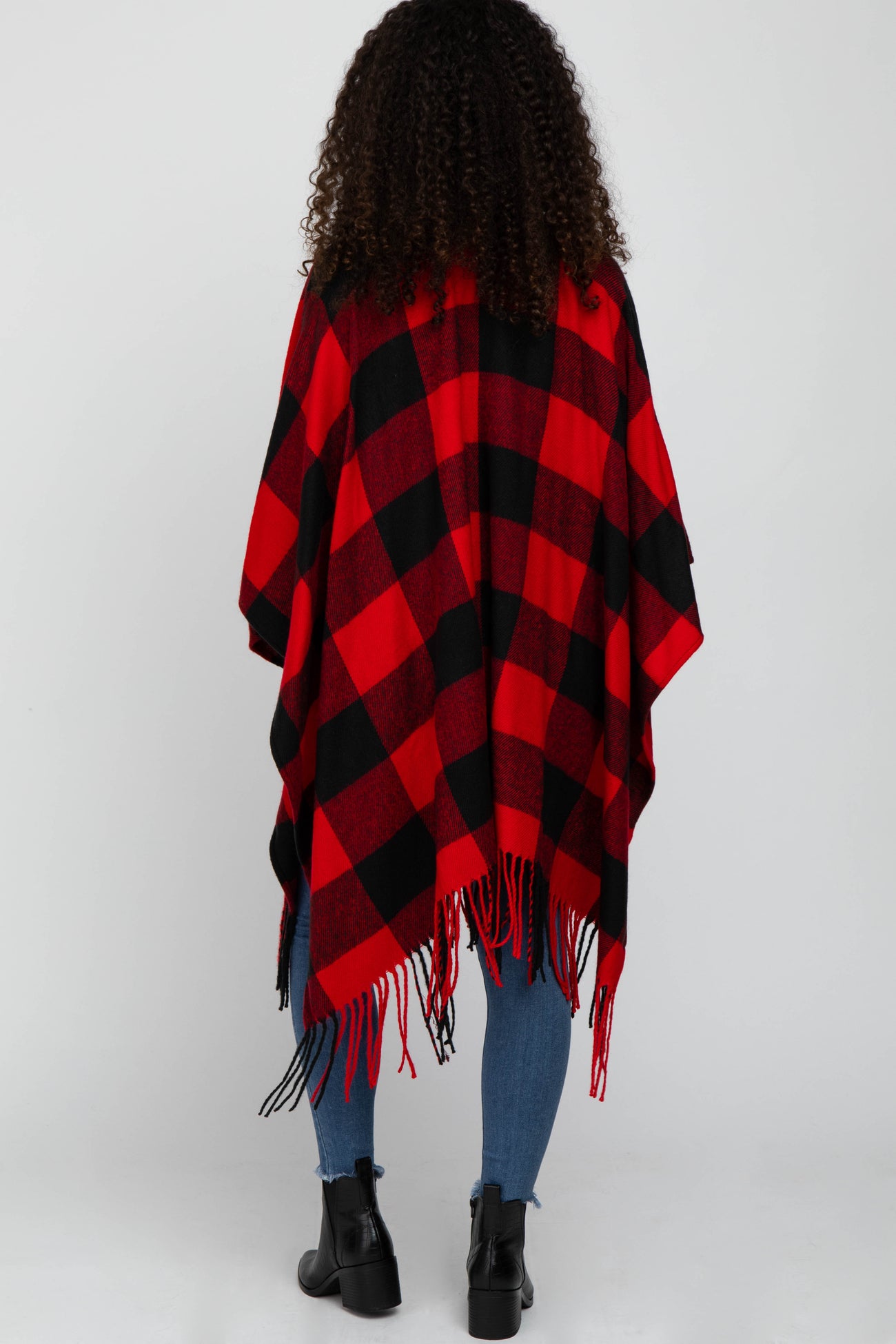 A soft knit shawl poncho featuring short sleeves, side slits, and a fringe hem.