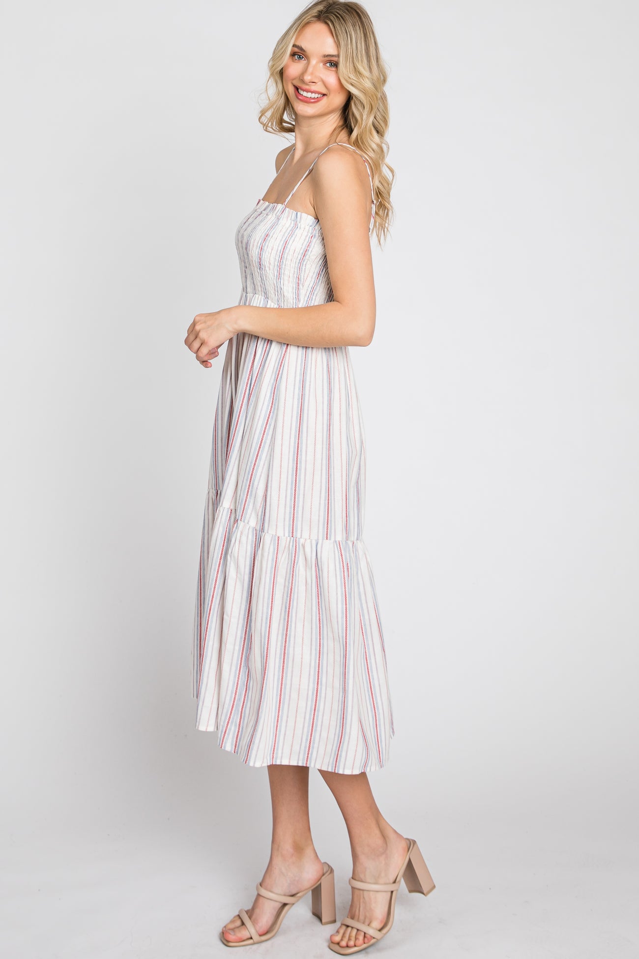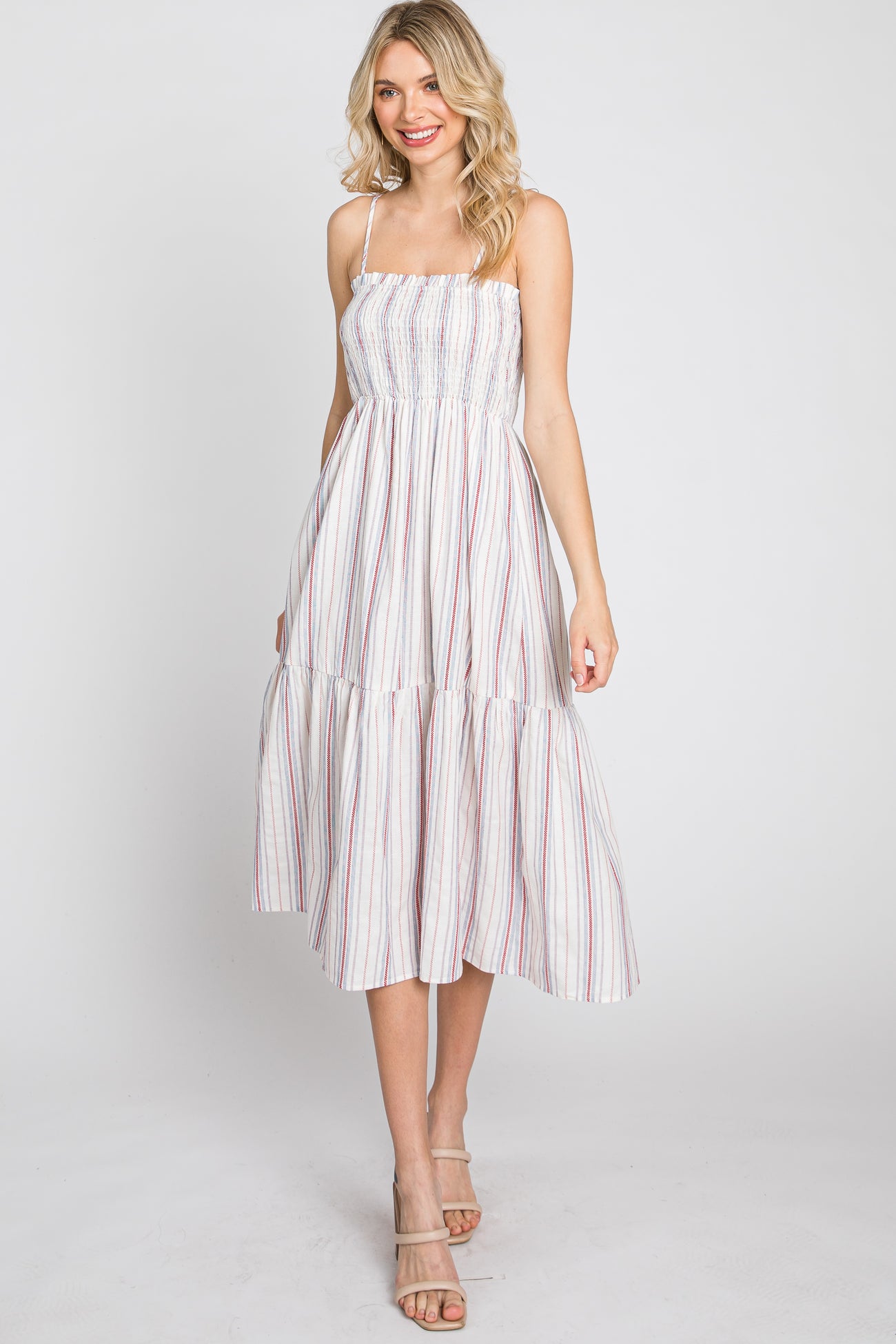 A striped midi dress featuring a square neckline, smocked elastic top, adjustable cami straps, and a ruffle hem.