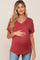 A solid hued basic maternity top featuring short sleeves and a v-neckline.