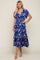 A floral print satin midi dress featuring a v-neckline and ruffle trim at the shoulders, waist and hem.
