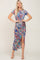 A multi-color floral maxi dress featuring short sleeves, side ruching, a side slit and a rounded neckline.