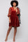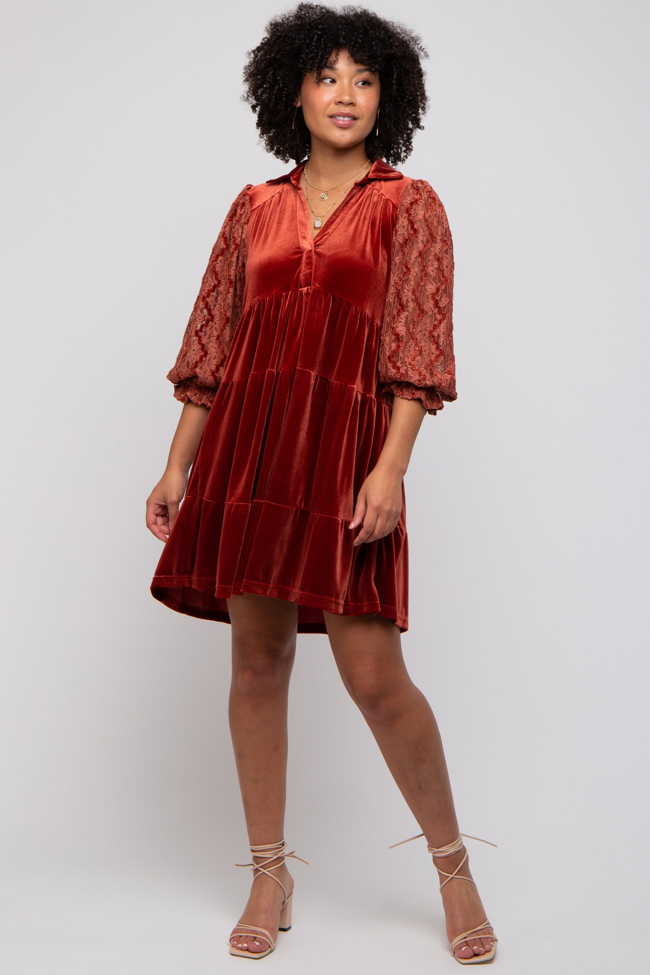 Rust Velvet Lace Sleeve Collared Tiered Dress
