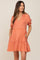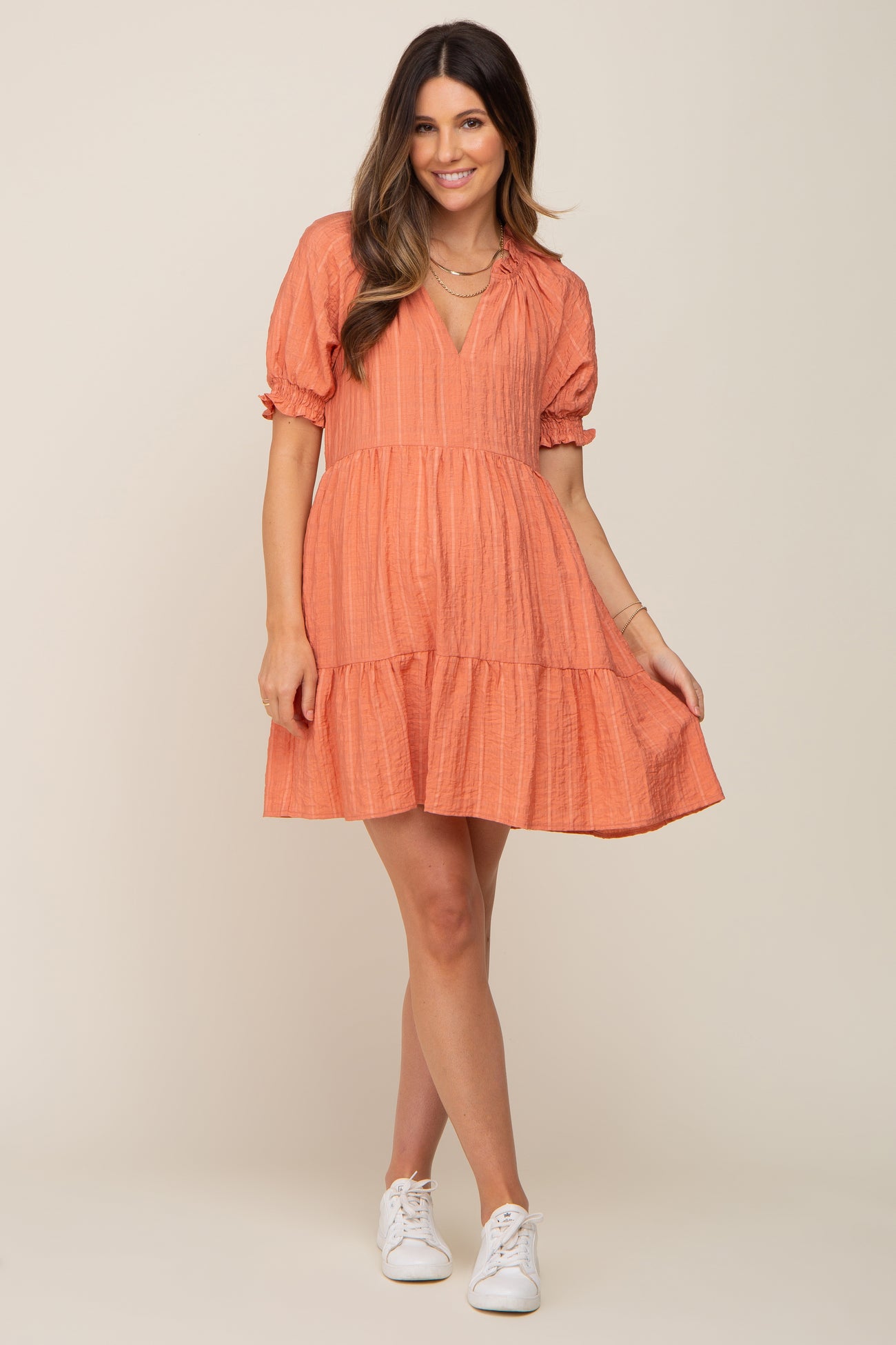 A monochrome striped maternity short dress with ruffle accents and short puff sleeves. Pocketed.