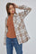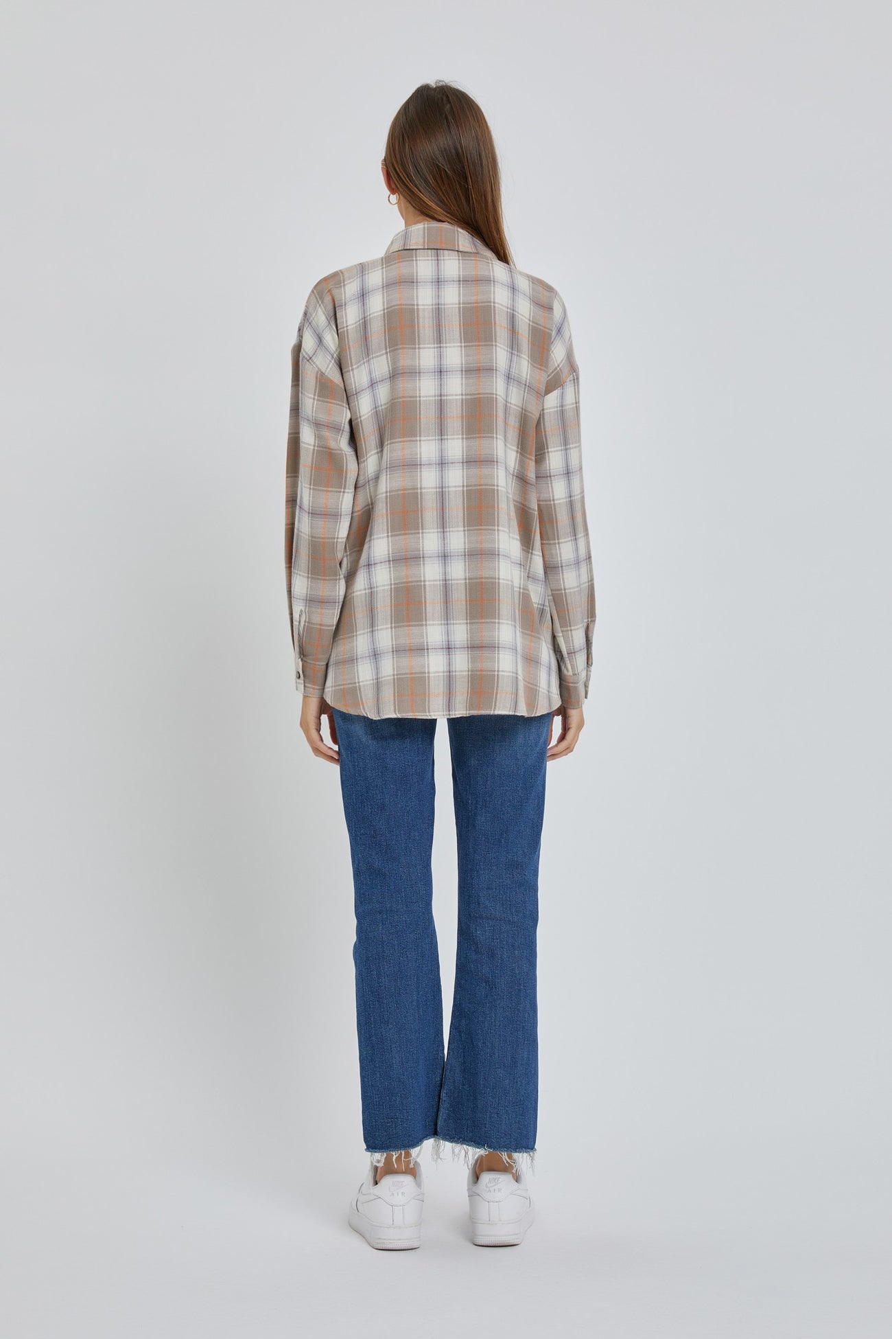 A soft flannel plaid top featuring a collared neckline, a button front, a front pocket, long sleeves and side slits.