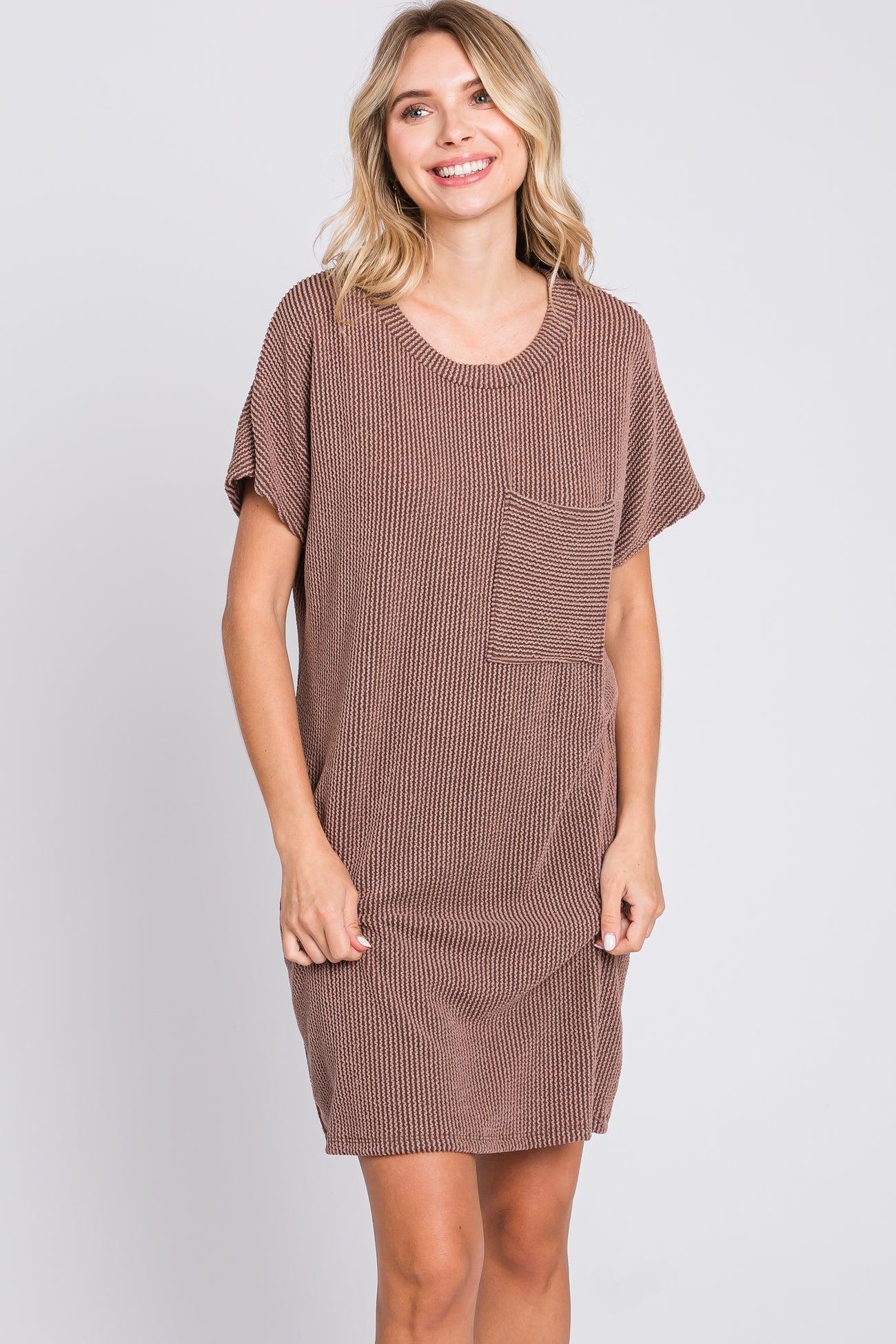 Taupe Ribbed Front Pocket Dolman Short Sleeve Dress