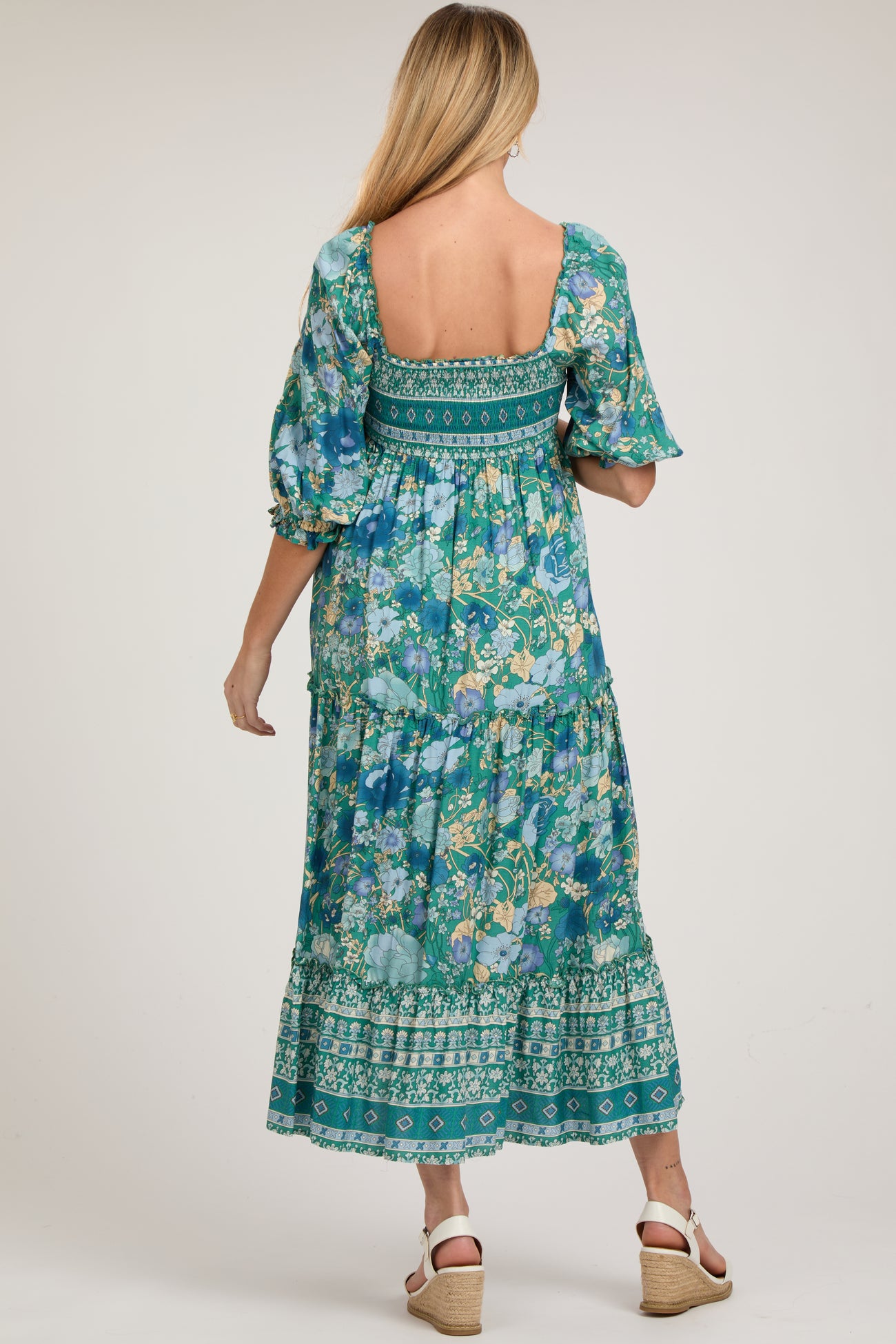 Details A floral print maternity midi dress with a ruffle accent squared neckline, half-length puff sleeves, a smocked bust, and a tiered accent skirt. Skirt is partially lined. Content + Care