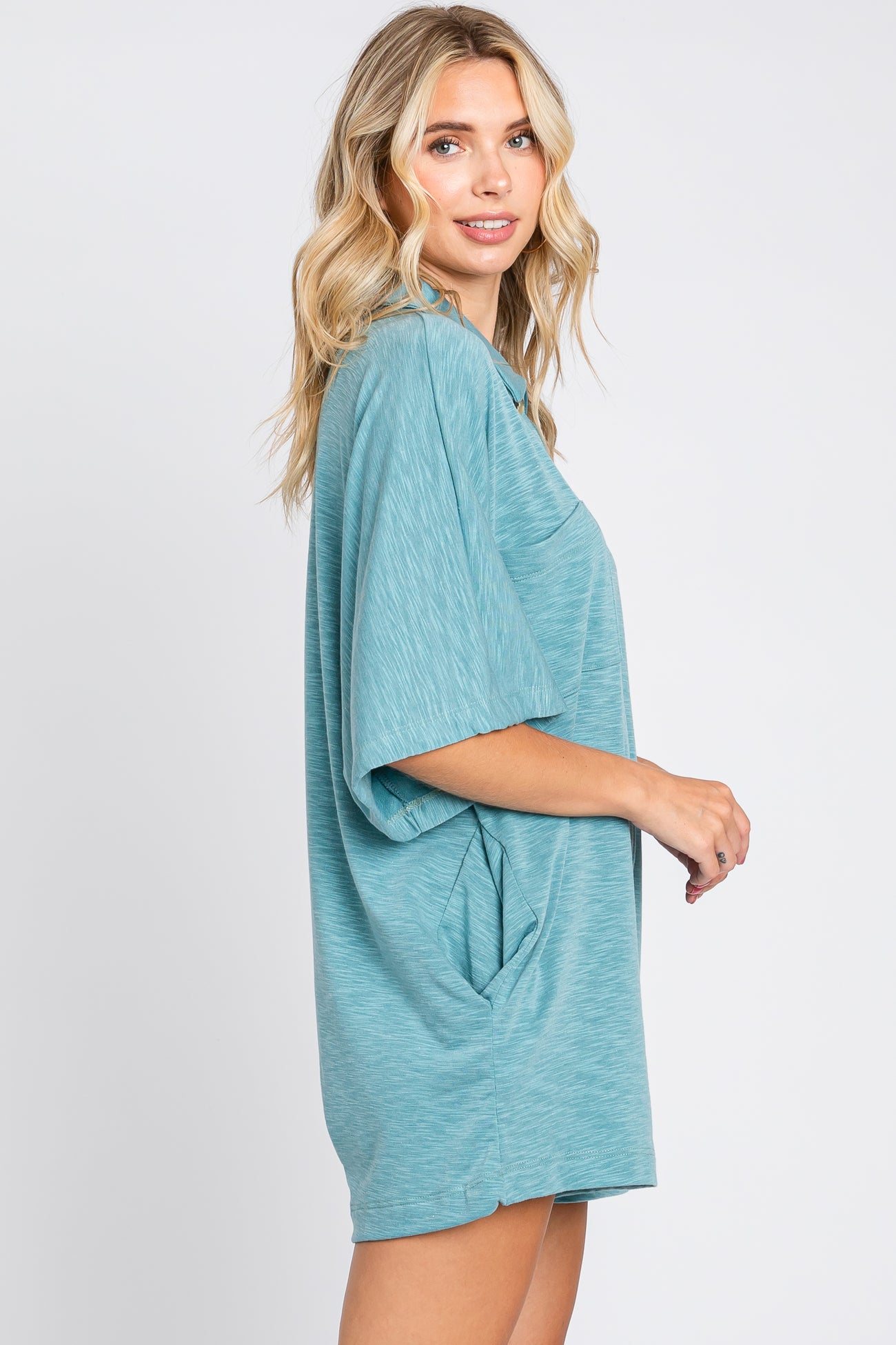 A heathered romper with a collar, front functioning buttons, a front pocket, short dolman sleeves, and side pockets.