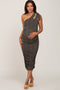 A ribbed maternity one piece swimsuit featuring a square neckline, ruched sides, adjustable straps with a ruffle trim and removeable pads.