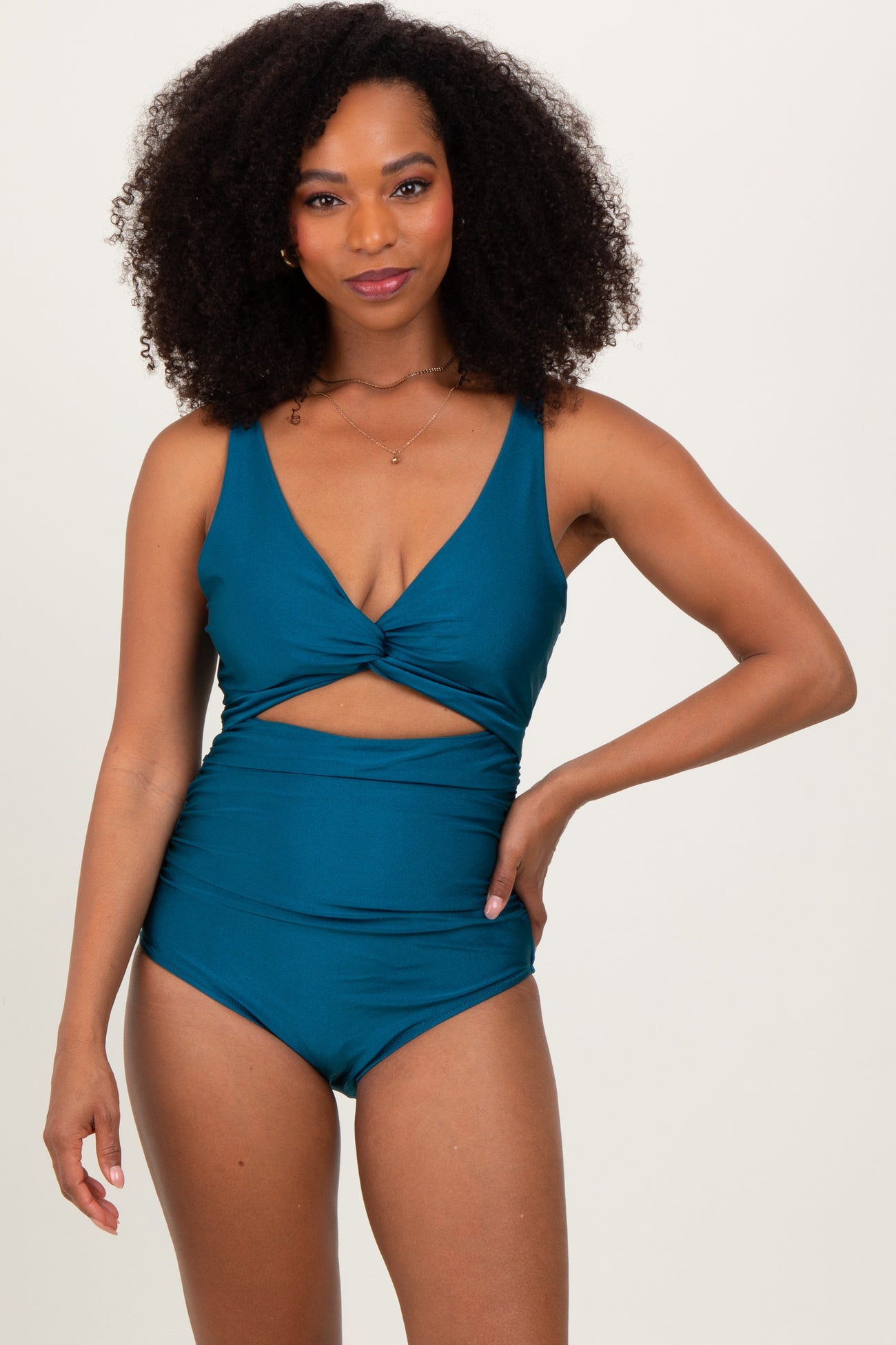 Teal Ruched Sides Front Cutout Maternity One Piece Swimsuit