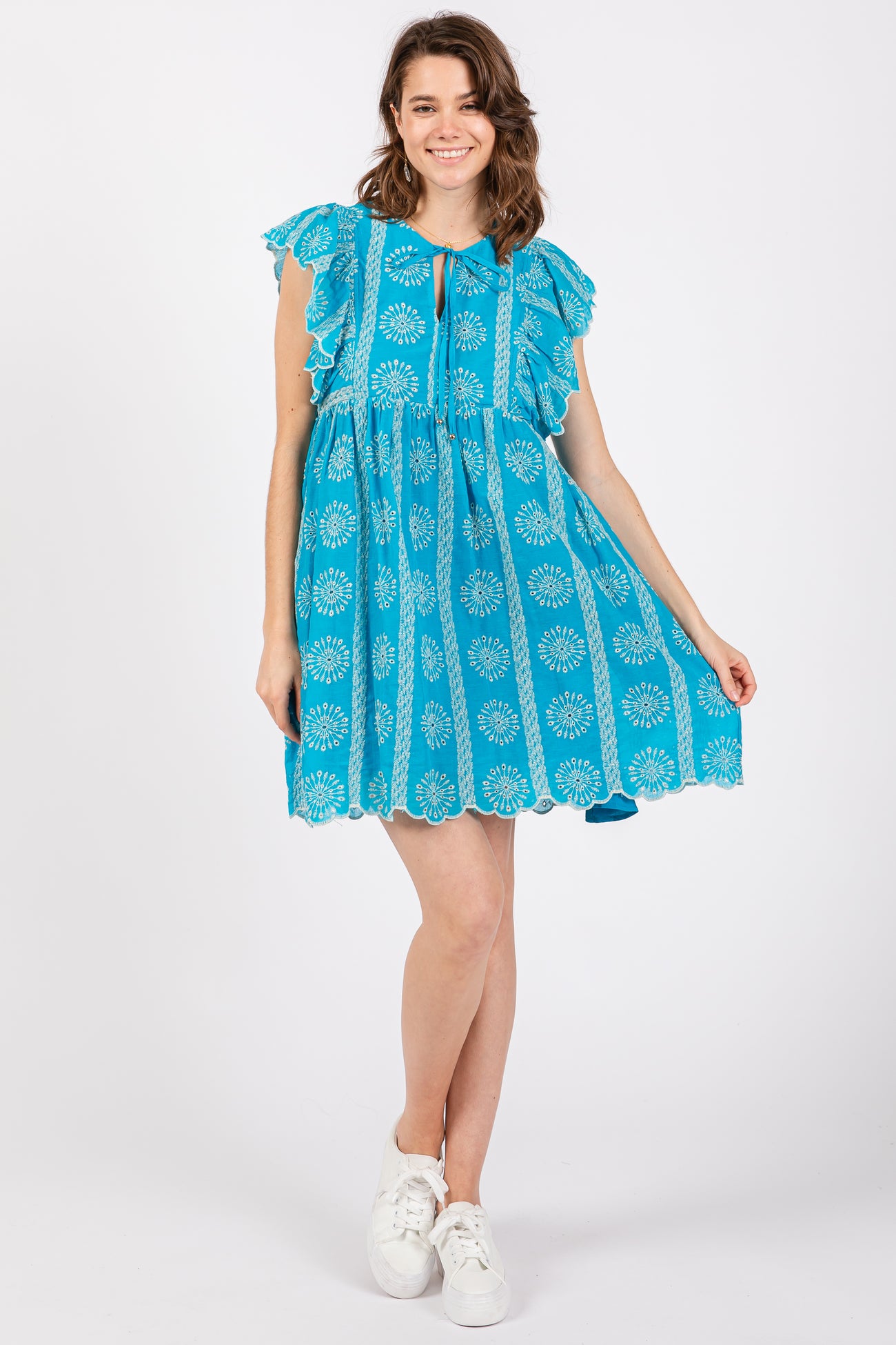 Details A dress featuring embroidered details, short flutter sleeves, side pockets and a self-tie neckline. Double lined. Content + Care