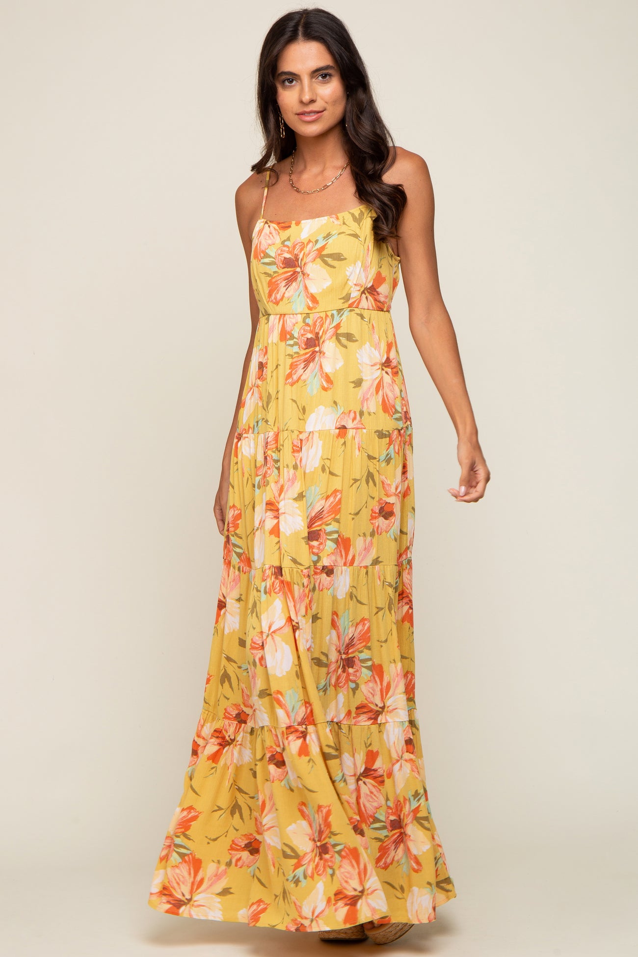 A floral maxi dress with a straight neckline, adjustable straps, a back zipper closure, and a tiered skirt. Dress is partially lined.