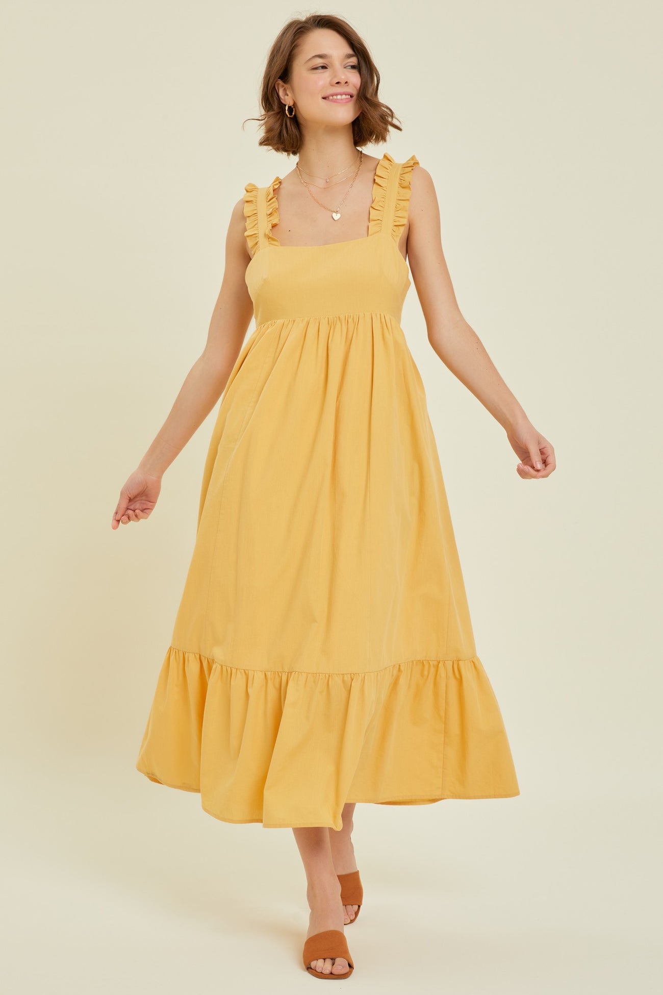 A midi dress with a squared neckline, adjustable ruffle accent straps, a back tie, side pockets, and a gathered bottom tier. Dress is lined