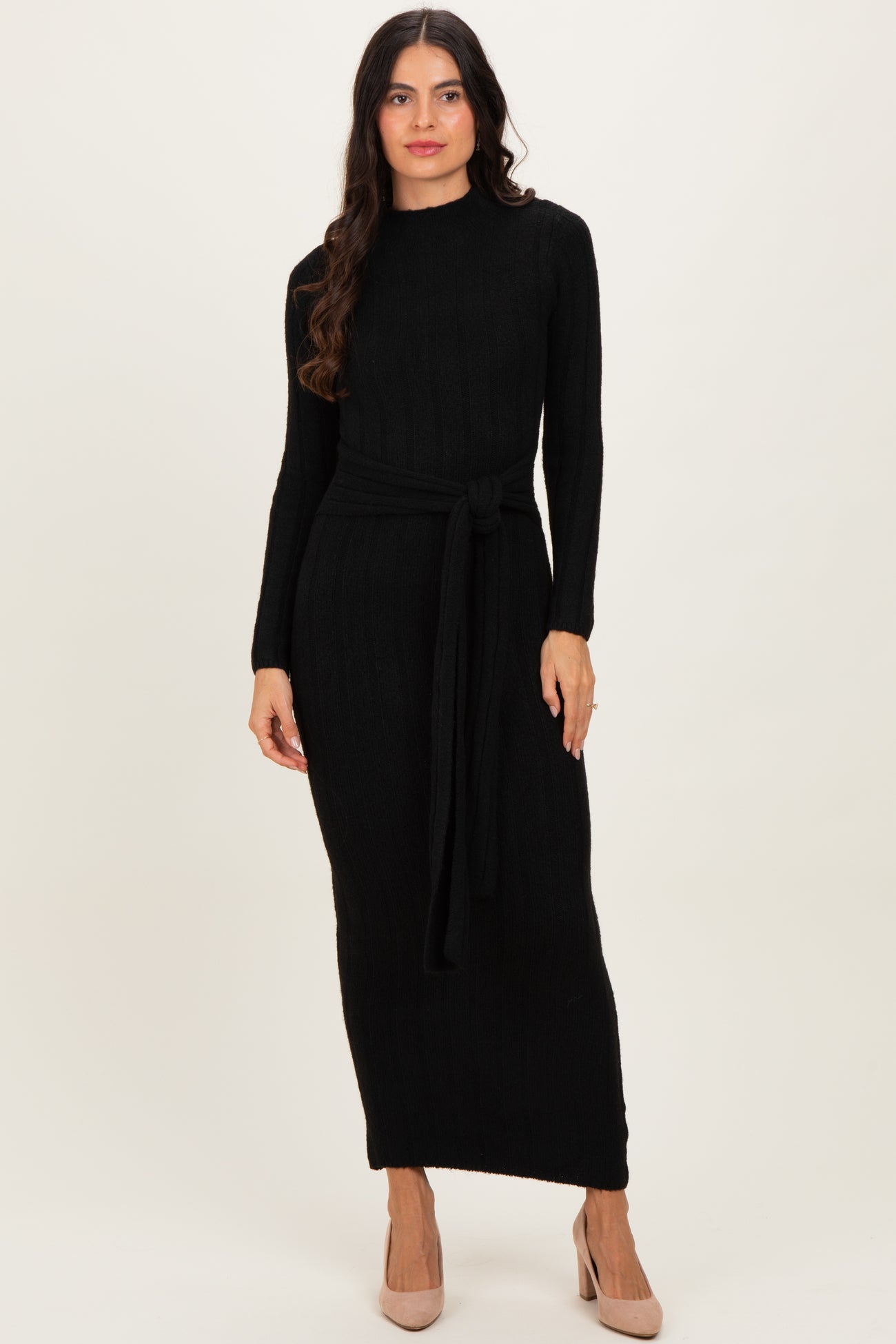 Elevate your style with our Black Ribbed Front Tie Maxi Sweater Dress. This chic dress features a flattering ribbed texture and a cozy knit fabric that hugs your silhouette beautifully. The front tie detail cinches the waist for a feminine touch, while the maxi length offers elegant coverage. Designed with long sleeves and a high neckline, it's perfect for layering on cooler days or wearing solo for a sleek, minimalist look. Pair it with heels or boots for a versatile outfit that transitions effortlessly from day to night. Comfortable, stylish, and timeless—your new wardrobe staple awaits!