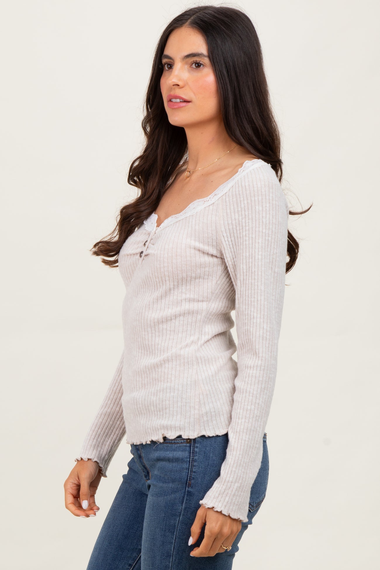 Beige Brushed Rib Lace Trimmed Henley Top