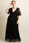 A solid hued babydoll dress featuring a raw edge, bell sleeves, a crochet trim, a rounded neckline and a back keyhole cutout with a button closure. This style runs big.
