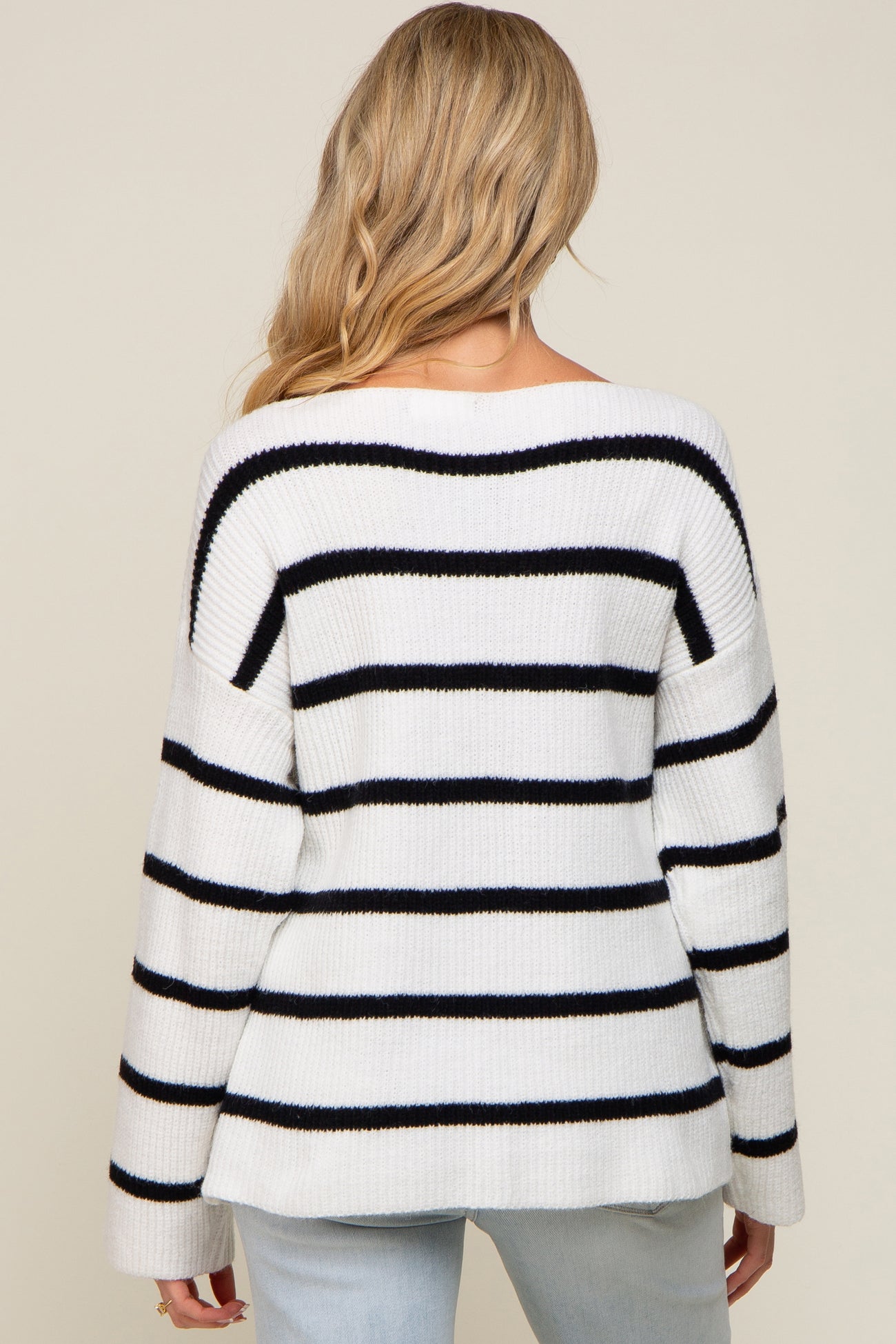 A striped chunky knit maternity sweater with a boat neckline. Can be worn off shoulder.