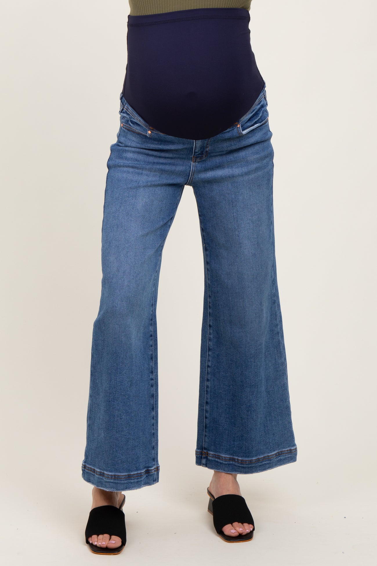 Blue Yoke Detail Ankle Wide Leg Maternity Jeans