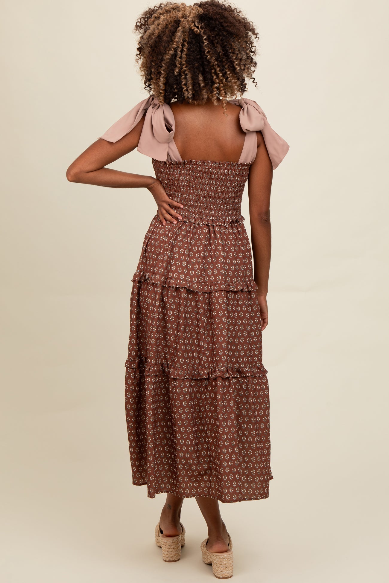 Brown Floral Print Contrast Shoulder Tie Tiered Midi Dress