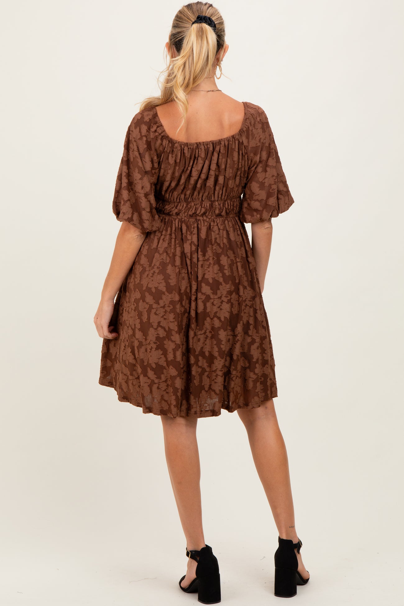 Embrace comfort and style with our Brown Floral Square Neck Maternity Dress. Designed with a flattering square neckline and delicate puff sleeves, this dress offers gentle elegance for any occasion. The soft, breathable fabric features a subtle floral jacquard pattern that adds texture and charm. An elasticized empire waist ensures the perfect fit through every trimester, providing comfort and room to grow. Easy to dress up or down, this versatile maternity dress is a must-have for your pregnancy wardrobe. Available in multiple sizes to accompany your journey beautifully.