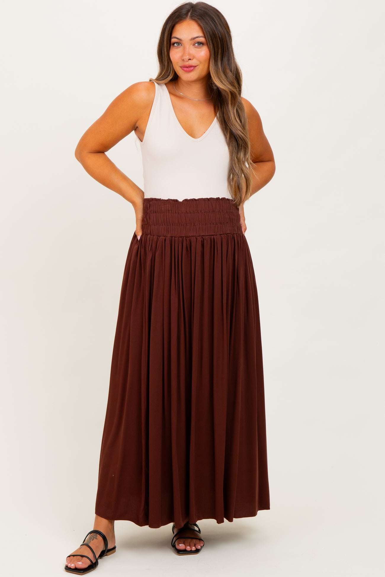 Brown Smocked Waistband Pleated Maternity Maxi Skirt