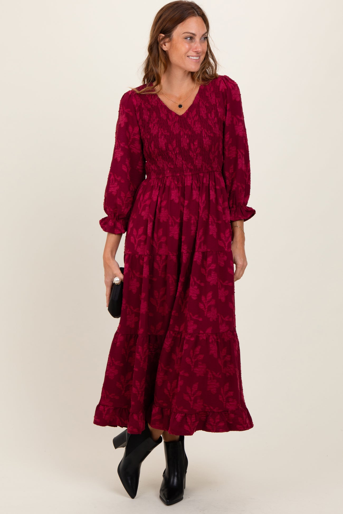 Burgundy Floral Smocked V-Neck Maxi Dress