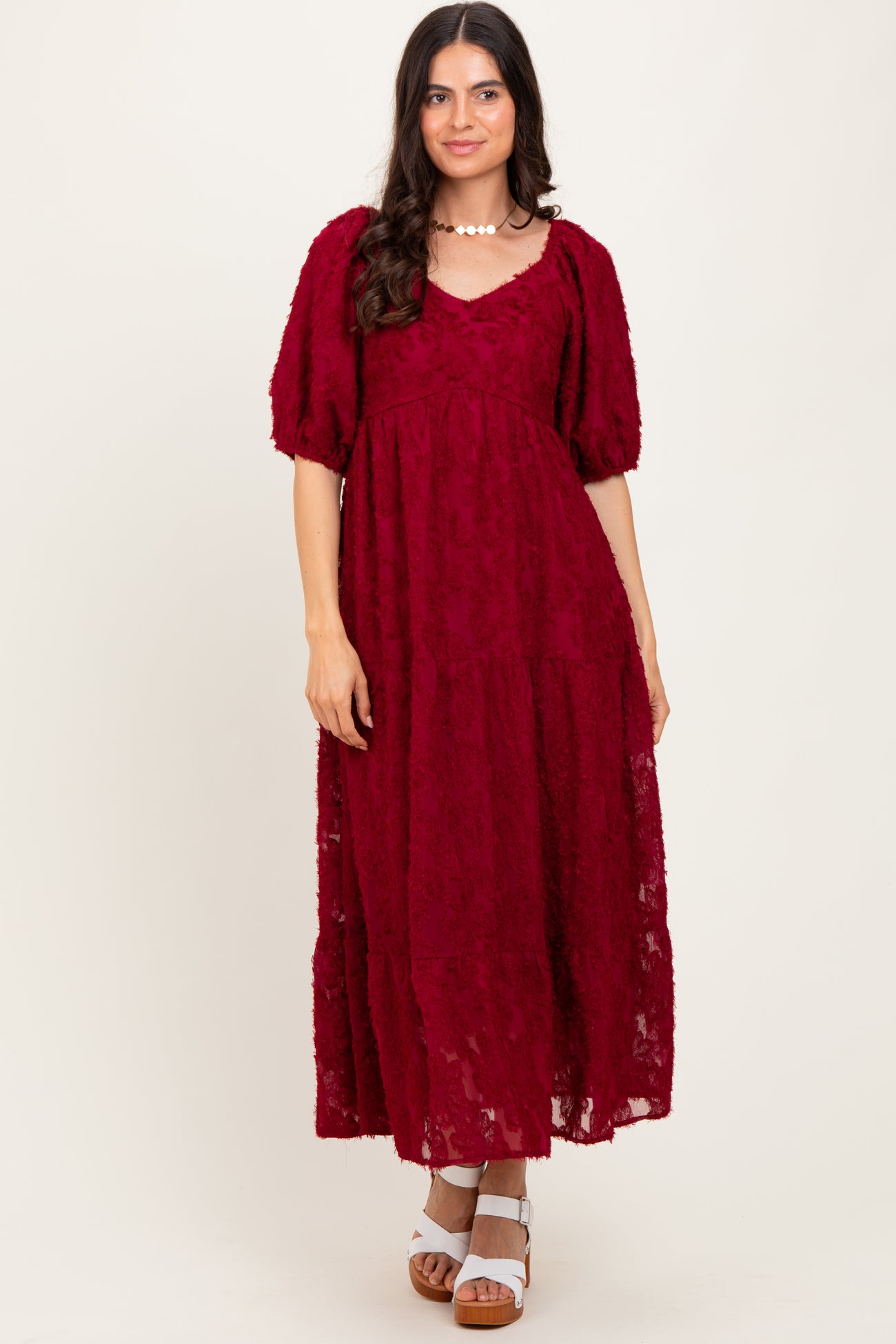 Burgundy Textured Tiered Midi Dress