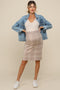 A linen maternity dress with short puff sleeves, a collar, front functioning buttons, a tiered skirt, and a frayed hem.