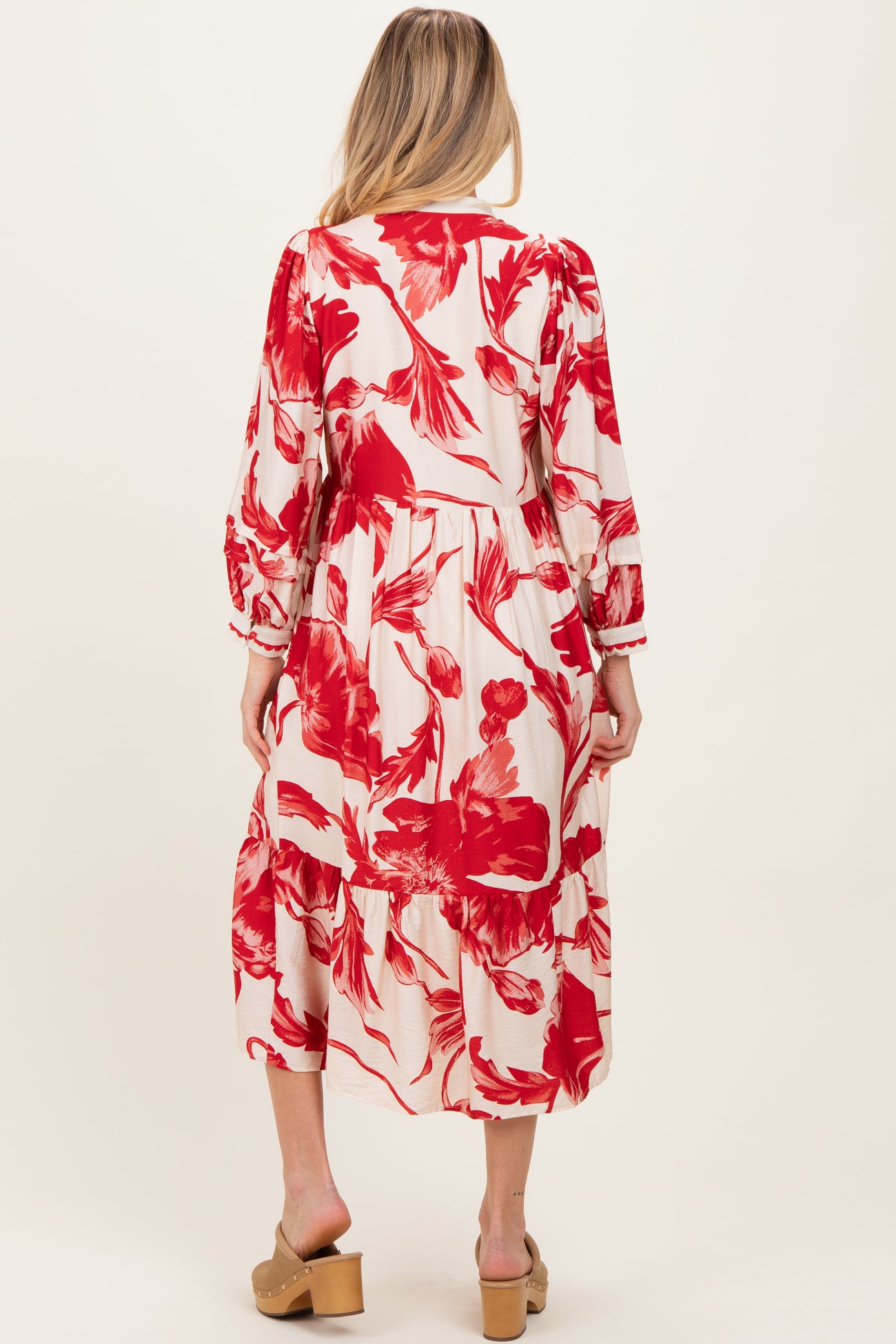 Cream/Red Big Floral Print Maternity Midi Dress