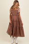 Details A mesh midi dress featuring a smocked bodice, adjustable shoulder ties, and a ruffle tiered skirt. Content + Care