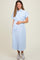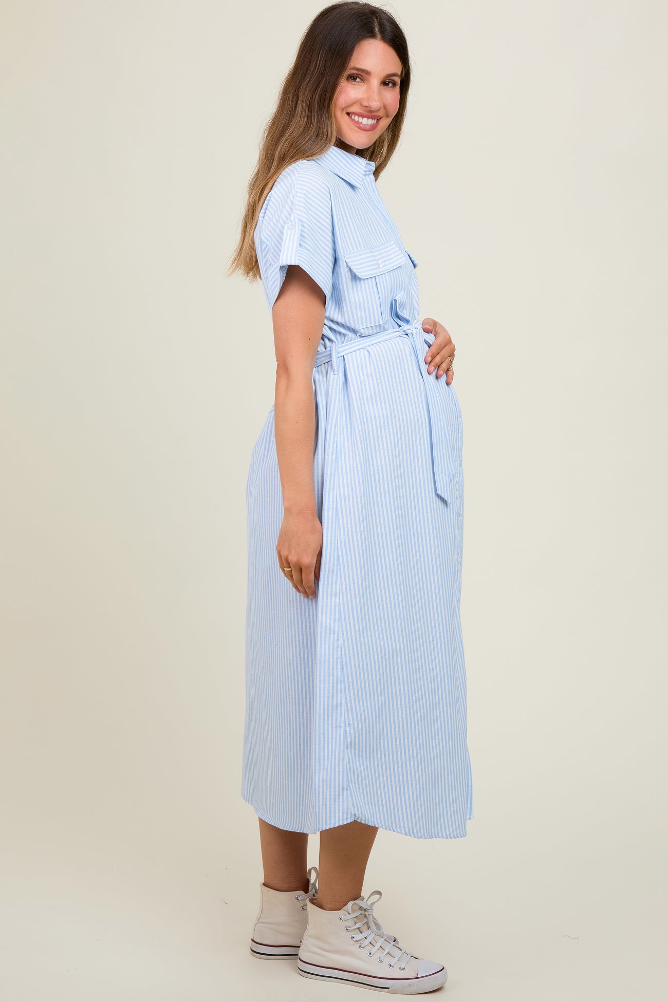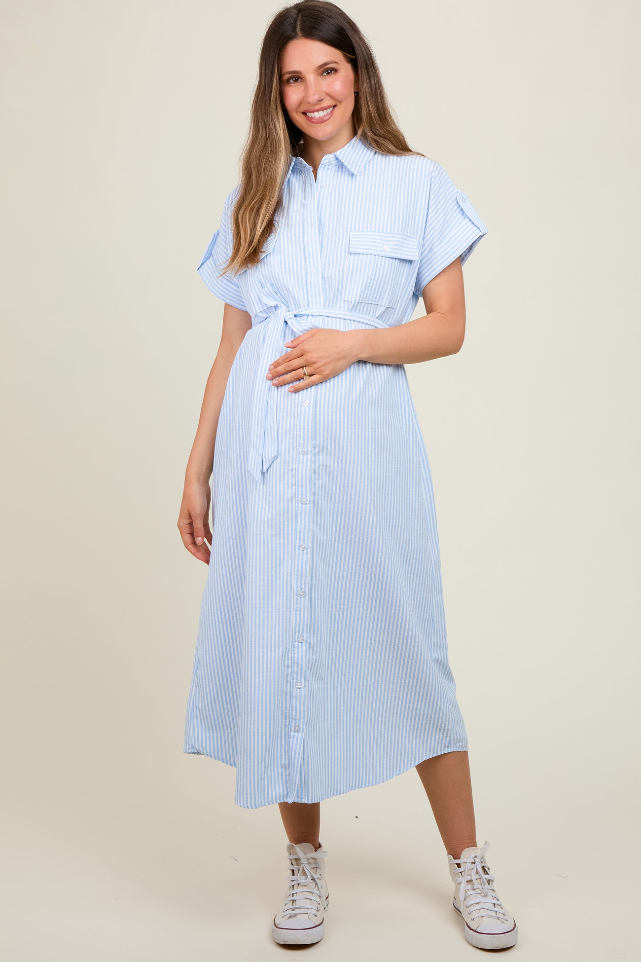 Light Blue Pin Stripe Sash Tie Maternity Midi Dress