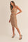 Details A solid fitted ruched midi dress with front cutout and strap details. Dress is lined. Content + Care
